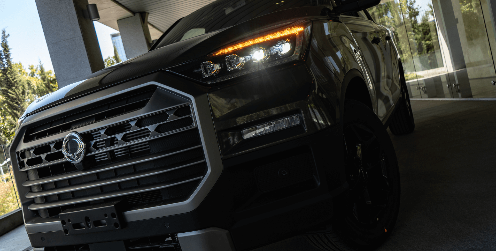 El frontal de la KGM Musso destaca por su parrilla imponente y ópticas definidas, transmitiendo fuerza y presencia desde el primer vistazo. Un diseño que refleja su espíritu resistente y su vocación de trabajo.